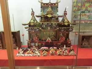 金子文夫はこの地の郷土史家、収集家です。この地に伝わる様々な郷土文化を伝えるものを収集しました。この雛飾りは御殿が特別に大きく豪華で、特有の形をしています。当時の商家の繁栄ぶりを象徴しています。